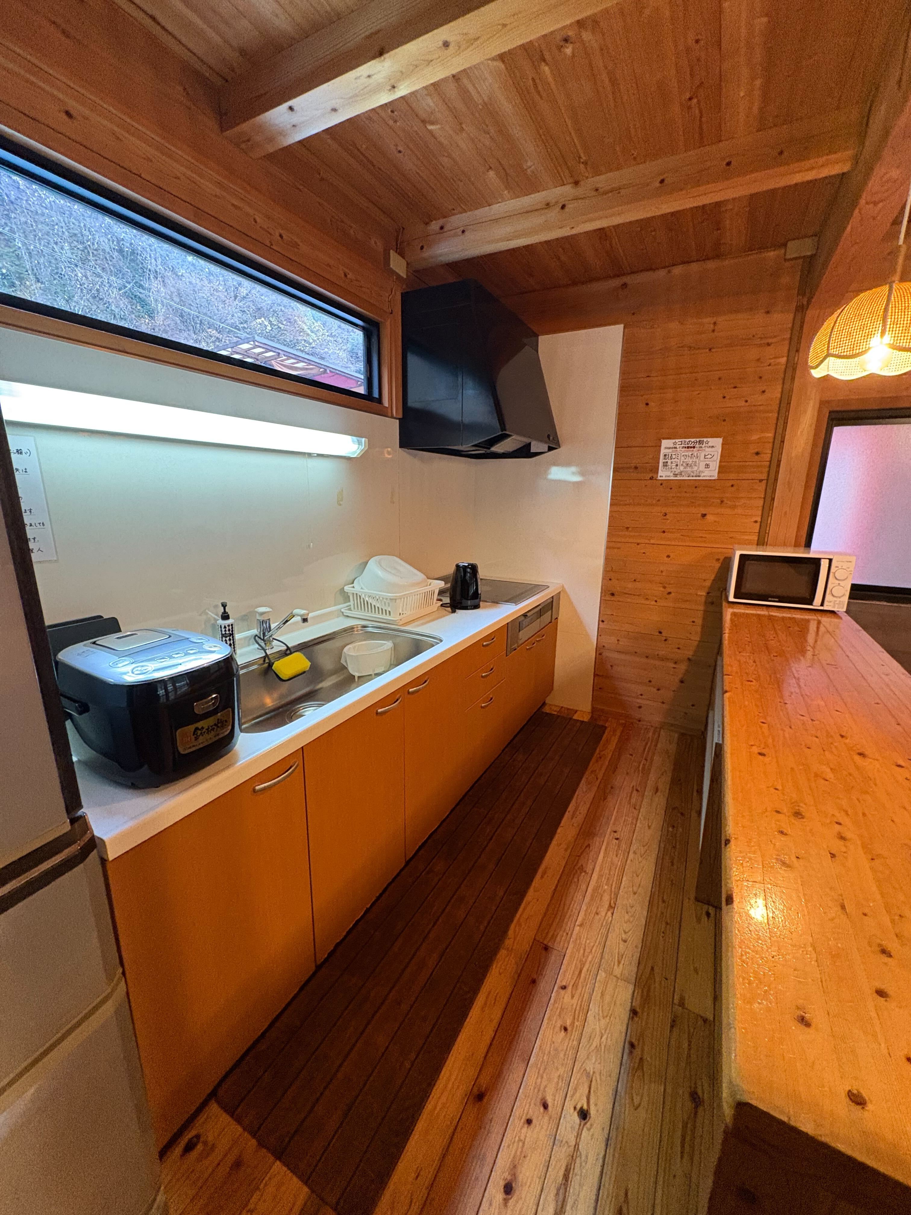 大き目のシステムキッチンを初め炊飯器・大型冷蔵庫・調理器具・テレビ等完備しておりますので食材と着替え類程度の荷物で気軽にお越し頂けます。